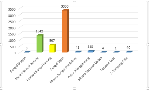 Berdasarkan data di grafik 2 terlihat bahwa jumlah pertemuan yang paling tinggi berada di Sungai Siput dengan dominasi dari jenis Limosa limosa dengan jumlah 2.500 individu, yang diikuti jenis Limosa lapponica sebanyak 200 individu dan yang tidak teridentifikasi 500 individu. Belum diketahui secara pasti keberadaan burung lebih banyak di temukan sungai siput akan tetapi hal ini bisa dikarenakan faktor makanan yang masih melimpah di areal sungai tersebut dan habitatnya tidak mendapat gangguan.