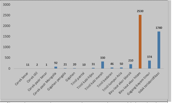 Dari grafik diatas menunjukan bahwa Jenis yang paling dominan bertemu adalah Limosa limosa atau yang dikenal dengan Biru-laut ekor hitam yang banyak ditemukan di wilayah sungai siput lebih dari 2.500 individu. Untuk urutan kedua dari jenis yang berhasil teridentifikasi adalah Gagang bayam timur lebih dari 374 individu lebih yang hanya ditemukan dilokasi tambak di wilayah solok buntu.Sedangkan jenis ketiga yang ditemukan adalah jenis trinil kaki merah dengan jumlah pertemuan 350 ekor.