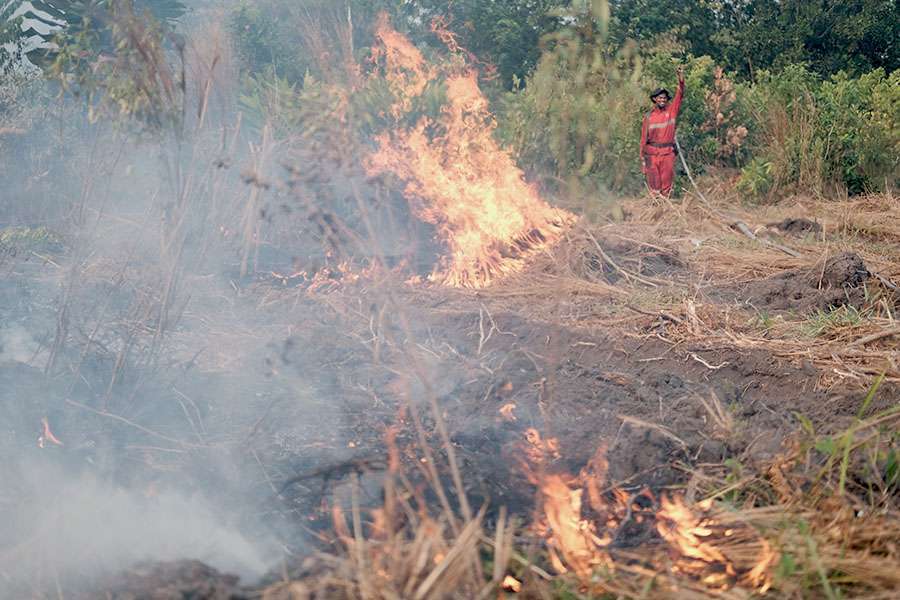 Seorang warga Desa Tanjung Seteko, Kecamatan Indralaya, Kabupaten Ogan Ilir, Sumatera Selatan, turut memandamkan api di lahan yang terbakar. Foto: Ahmad Rizki Prabu.