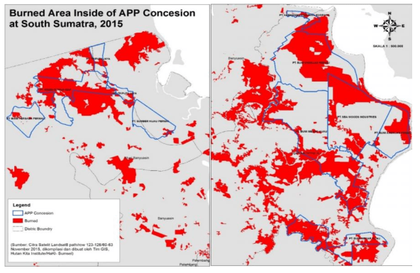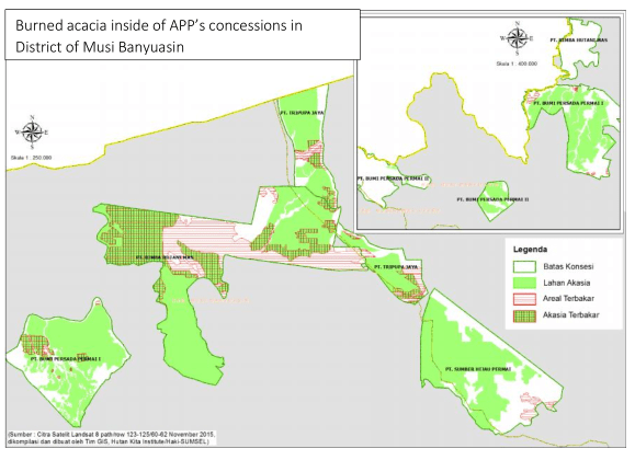 In early December 2015, this coalition of local NGOs in South Sumatra reported spatial analysis results indicating that the total burned areas inside of concessions associated with Asia Pulp and Paper in South Sumatra was 293,065 Ha, or nearly 37% of its entire concession area in the province. (^1)