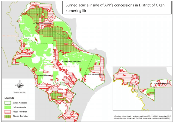 Now, this coalition reports its analysis of how much of APP’s pulpwood plantations, primarily Acacia trees, burned in the 2015 fires. The spatial analysis supported by ground checks indicates that 86,004 Ha of APP’s plantations in South Sumatra were burned. This amounts to about 26% of APP’s total planted area in the province. Our analysis raises serious questions about how this significant plantation loss will influence the fiber supply for APP’s new mega-scale pulp mill, PT. OKI Mill, which the company has announced will start operation later in 2016. This mill, according to company statements, will have a capacity of 2 million tons of pulp and 500,000 tons of tissue per year, which will make it one of the largest pulp mills in the world.(^ 2 )