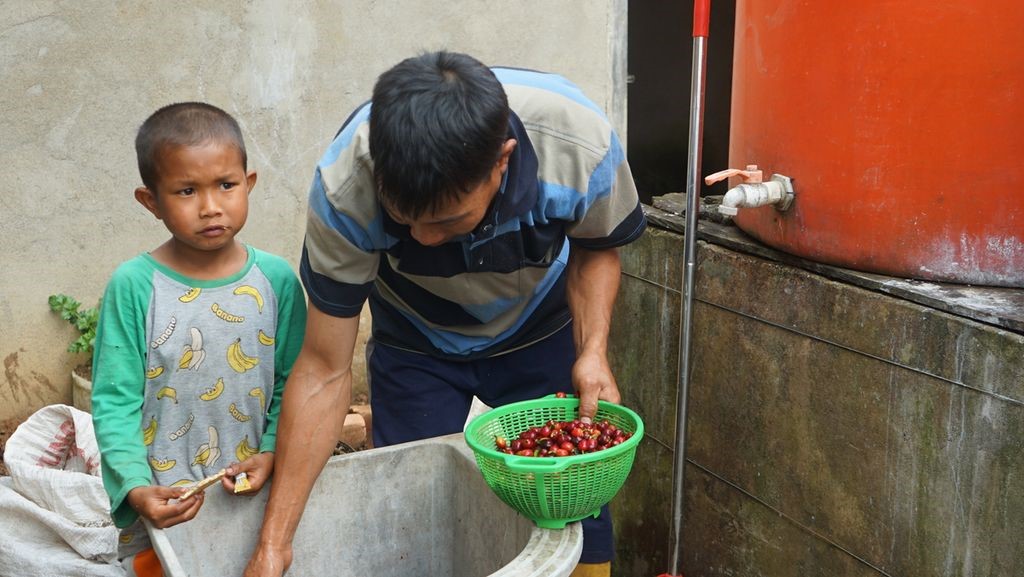 Dengan telaten, ibu empat anak ini memetik kopi biji merah yang ditanam di lahan pada ketinggian 1.400 meter di atas permukaan laut (mdpl). ”Apabila biji kopi sudah merah bertanda telah matang,” jelasnya sembari terus memetik. Setelah terkumpul sekitar 3 kilogram (kg), kopi biji merah yang ia kumpulkan itu langsung diberikan kepada suaminya, Zamran (30).