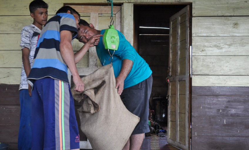 Direktur Program dan Jaringan HaKI Deddy Permana dan Ketua Lembaga Pengelola Hutan Desa (LPHD) Monika membantu Jamran mengangkat karung isi biji kopi green bean. Hari itu, mereka mendapatkan 15 kilogram pertama hasil panen kopi arabika dari kebun demplot Hutan Desa.