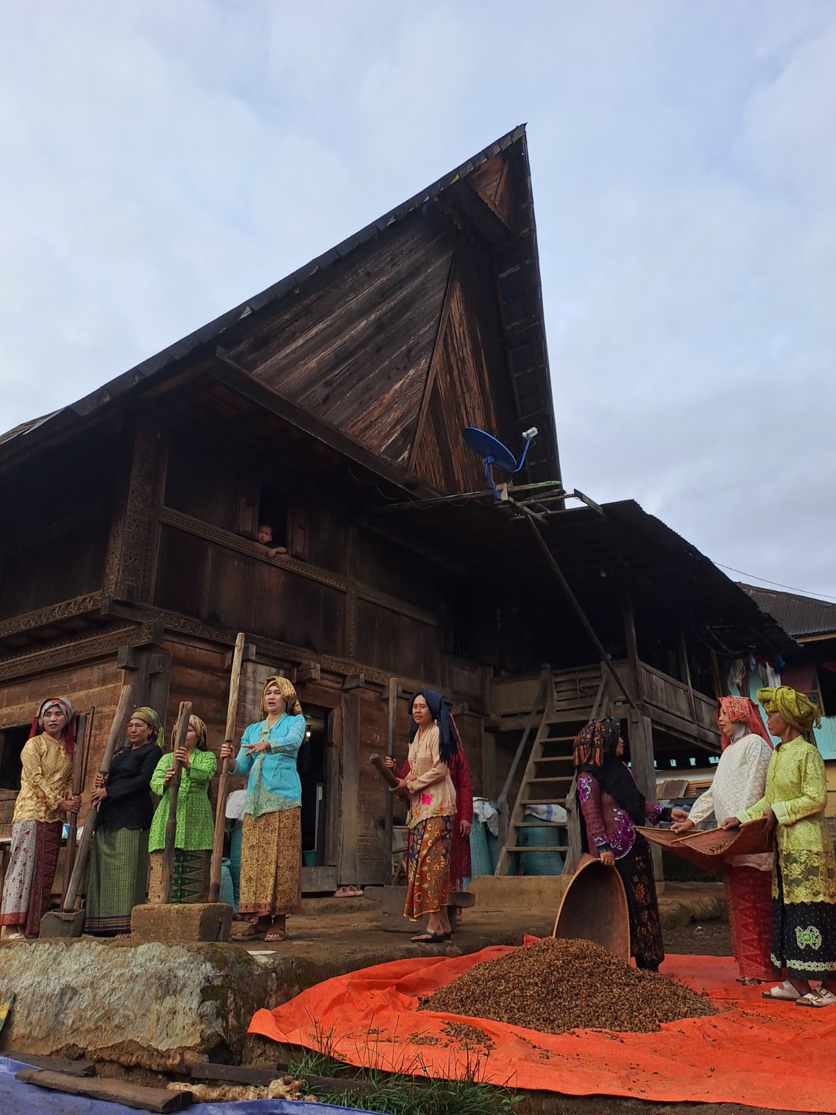 dan mengeringkan biji kopi di depan rumah tradisional. Kegiatan ini menjadi bagian penting